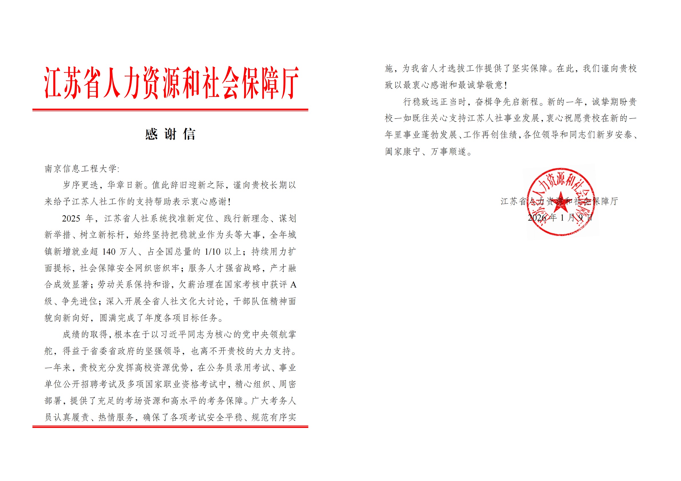 近日,江苏省人力资源和社会保障厅向我校发来感谢信,对我校长期以来为江苏人社工作给予的大力支持帮助表示感谢。