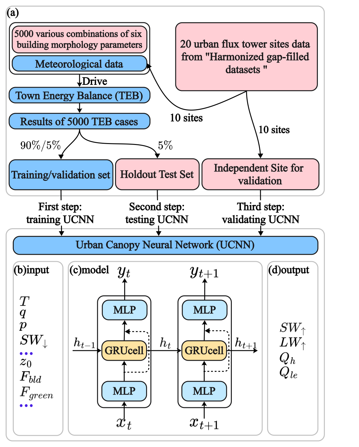 针对这一问题,研究团队提出了一种面向复杂建筑形态的深度学习城市冠层模型UCNN(Urban Canopy Neural Network)。首先,基于经典城市冠层模型TEB构建了5000组不同建筑形态参数组合,并结合全球二十多个城市通量塔观测数据,生成了大规模训练样本。随后,利用独立站点观测资料对模型泛化能力进行了系统检验。结果表明,UCNN不仅能够较好学习传统物理模型的能量交换规律,而且在多个独立城市站点上表现出良好的稳定性和泛化能力。与原始TEB模型相比,UCNN在保持较高模拟精度的同时,计算效率提升显著,推理速度约提高5倍。在上行短波辐射、上行长波辐射、感热通量和潜热通量等关键能量通量模拟中,模型均取得了较好效果,部分指标达到或优于现有主流城市冠层模型的平均水平。该研究表明,深度学习方法在复杂城市下垫面参数化方面具有良好的应用潜力,可为未来天气和气候模式中的城市过程表示提供新的技术路径。研究成果为复杂建筑形态条件下城市冠层模型的智能化发展提供了新的思路。