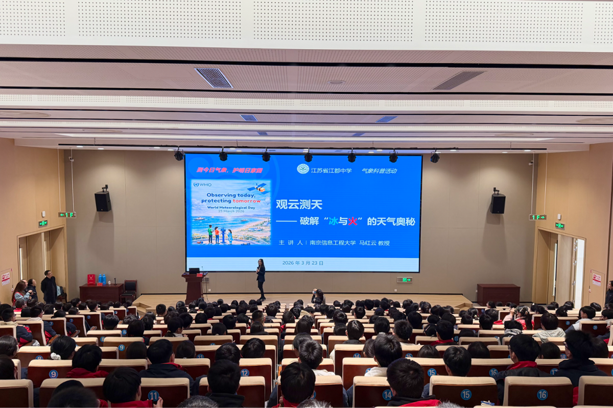活动伊始,气象科普讲座在江都中学新校区礼堂精彩开讲。大气科学学院马红云教授以《观云测天——破解“冰与火”的天气奥秘》为题,紧扣“测今日气象,护明日家园”的世界气象日主题,通过翔实的数据展示了近几十年来全球各地区气温变化趋势。她还结合具体案例剖析了全球变暖对人类生产生活、经济社会发展的多重影响,让同学们深刻认识到气象观测、气象研究的现实意义,更点燃了同学们探索大气科学的热情。