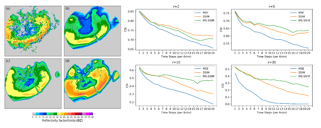 左图为不同损失函数方案对旋转移动的对流系统的外推结果比较:其中,(a)2 h外推后的雷达真实观测,(b) MSE损失函数方案的2 h外推结果,(c)SSIM损失函数方案的2 h外推结果,(d) MS-SSIM损失函数方案的2 h外推结果。右图为不同损失函数方案对整个测试集在不同的降水率阈值(2、5、10和30 mm/h)下的CSI评分表现。