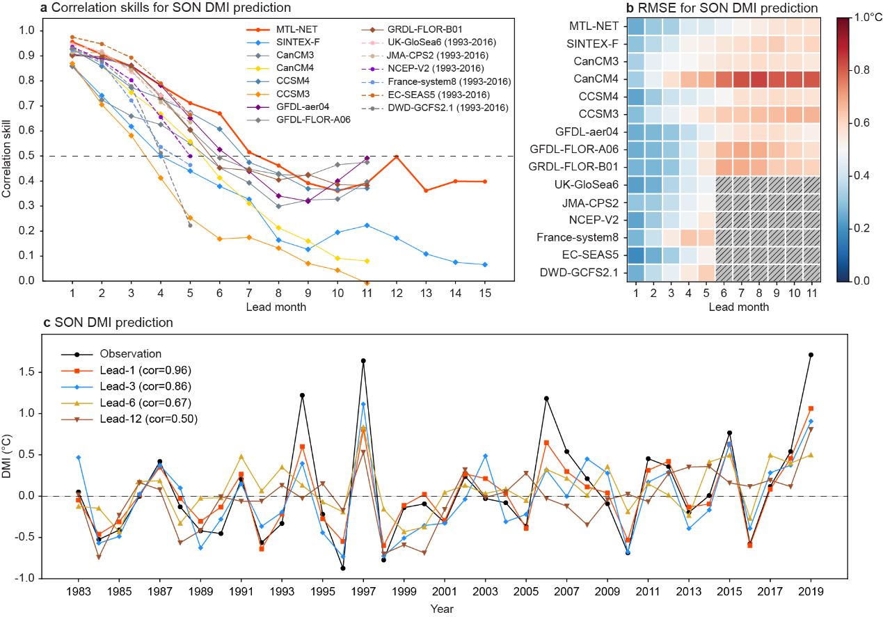 图1 多任务AI模型与14个动力模式预测系统对秋季印度洋偶极子指数的预测技巧对比。AI模型预测技巧超过了绝大多数目前最先进的气候预测系统,并可实现多季节尺度的预测。