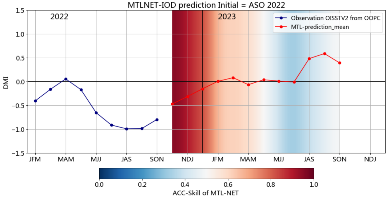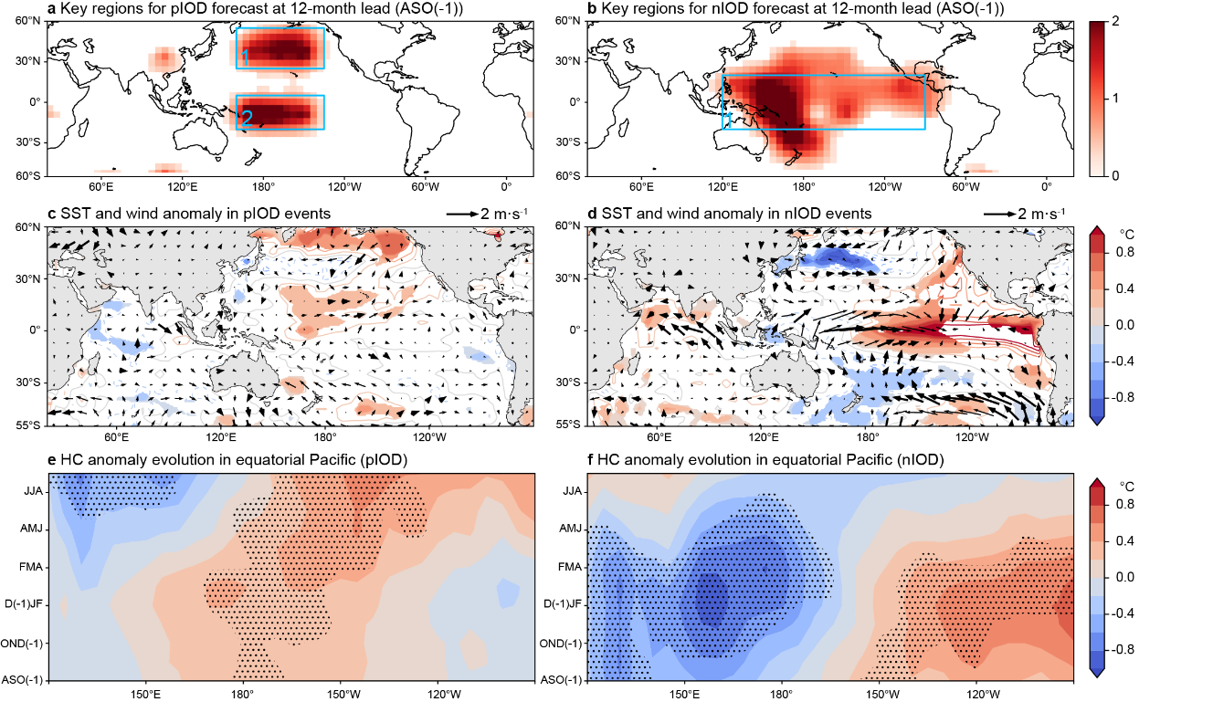 印度洋偶极子(IOD)是一种重要的气候信号,其特征是热带印度洋东西部海温和降水异常具有明显的东西向差异。IOD事件可以通过大气遥相关对世界许多地区的气候和环境产生重大影响,特别是在亚洲、非洲和澳大利亚。虽然在过去的几十年里人们不断改进气候预测系统和统计方法来提高IOD预测水平,但目前有效的预测技巧大多在3-5个月。