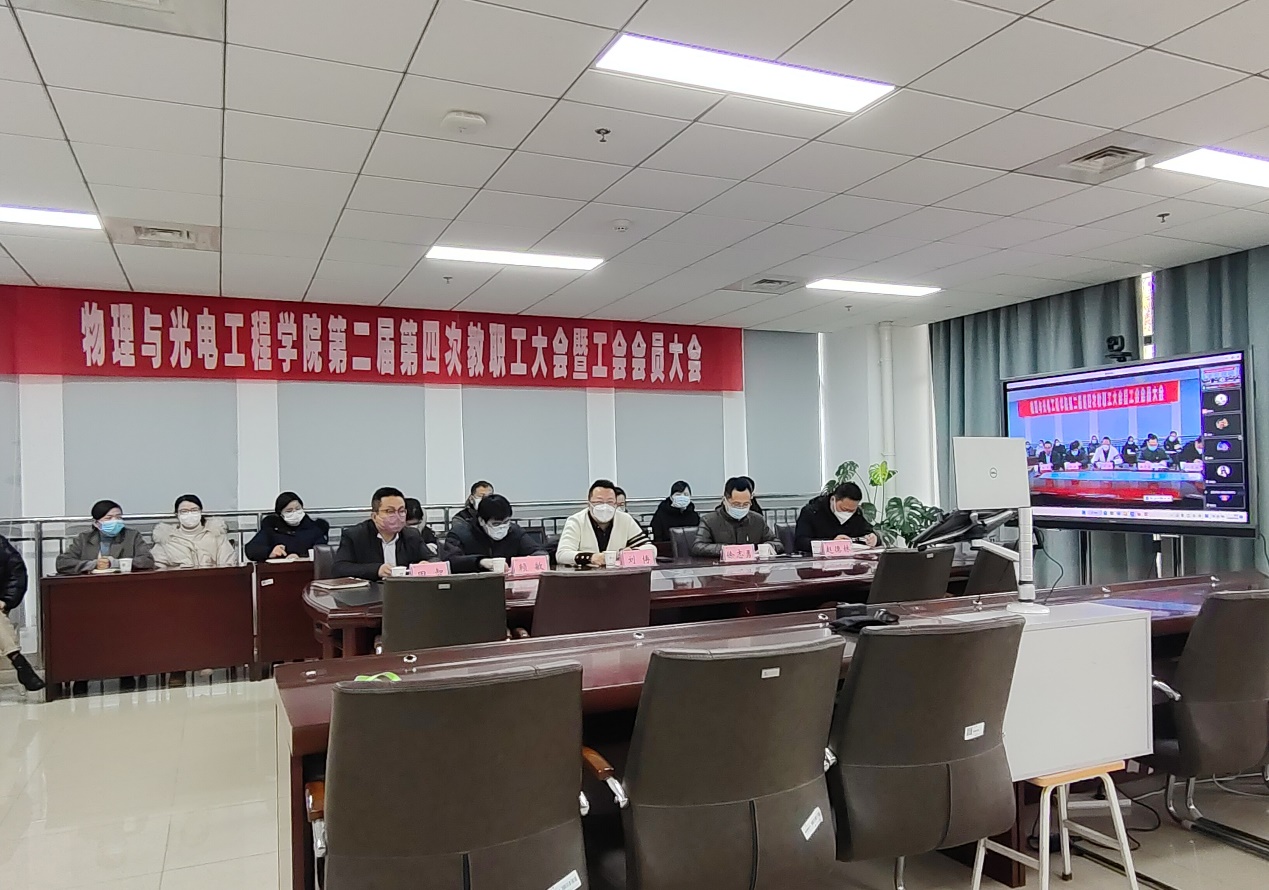 12月15日,物理与光电工程学院第二届第四次教职工大会暨工会会员大会在藕舫楼330室召开,会议采用线上线下相结合的方式。本次大会主题为“踔厉奋发 笃行不怠,推动学院事业发展新突破”。副校长刘博、物理与光电工程学院全体院领导、全体教职工暨工会会员参加会议。会议由院党委副书记兼副院长田智主持。