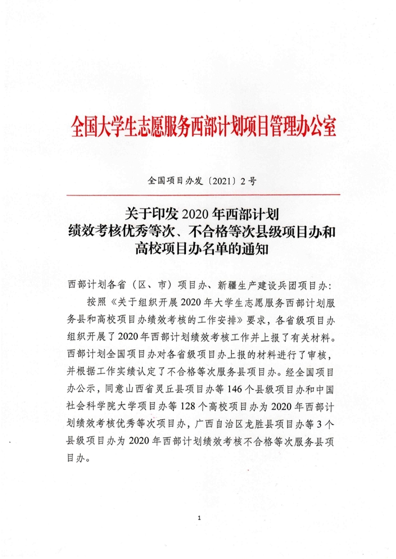 近日,全国大学生志愿服务西部计划项目管理办公室发布《关于印发2020年西部计划绩效考核优秀等次、不合格等次县级项目办和高校项目办名单的通知》(全国项目办发〔2021〕2号),我校获评“2020年西部计划绩效考核优秀等次高校项目办”,江苏共5所高校获此殊荣。