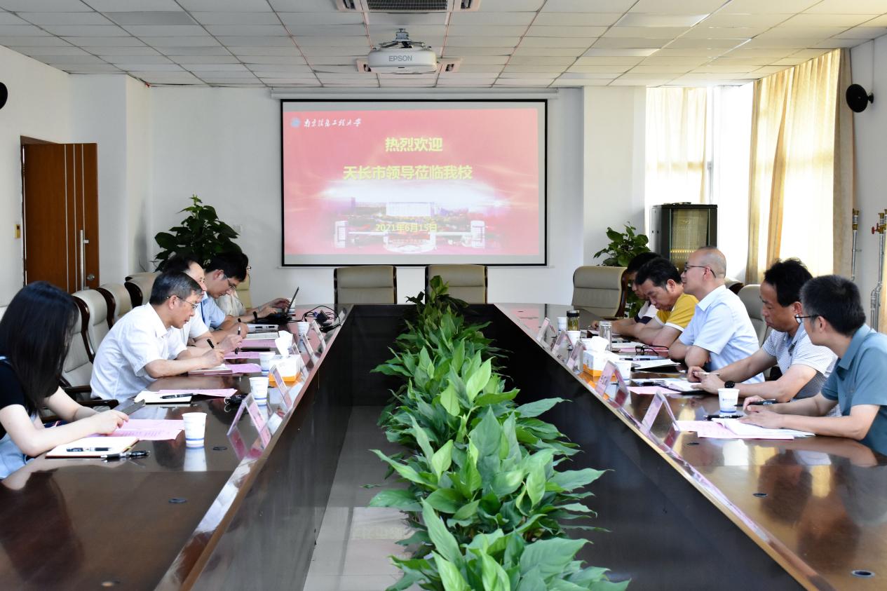 肖新对我校近年来发展面貌表示充分肯定,并简要介绍了天长市科创面貌。他表示,天长市委、市政府一直高度重视和支持科技工作,大力实施创新驱动发展战略和知识产权强市战略,并先后荣获“全国科技进步示范市”“全国知识产权强县工程试点市”等称号。天长市科技创新氛围高、产业基础好。希望充分发挥南信大特色学科和天长经济、社会等优势,共同推进天长优势产业发展和社会进步,引领天长市经济高质量发展。