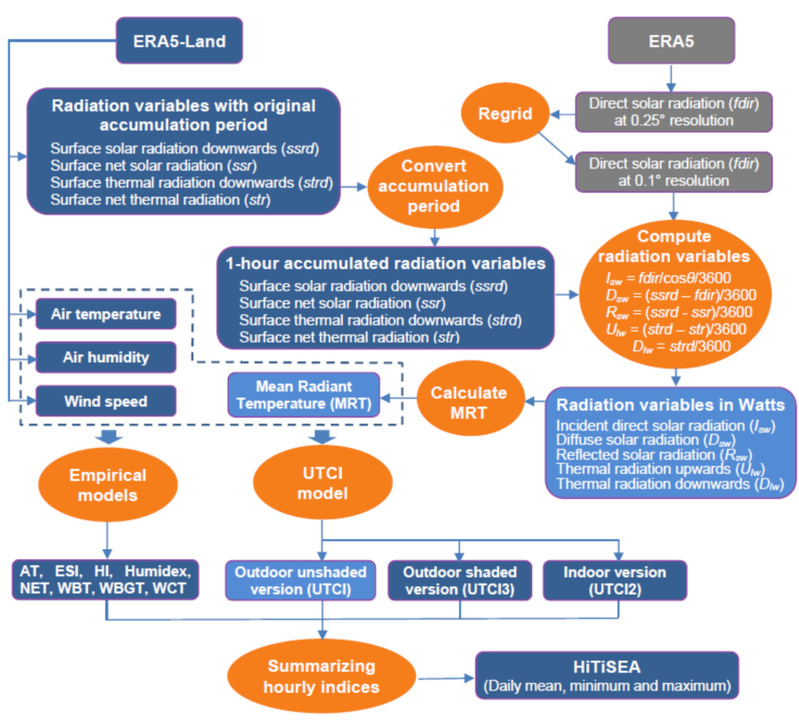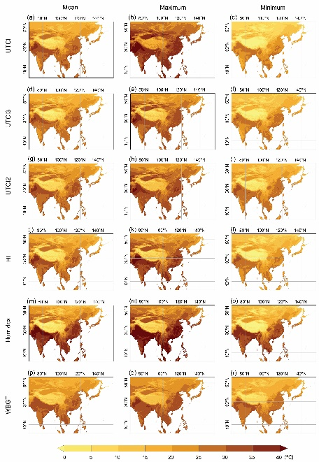 研究团队基于欧洲中期天气预报中心(European Centre for Medium-Range Weather Forecasts,ECMWF)提供的ERA5-Land和ERA5再分析资料,采用目前最先进的人体舒适度机理模型和其他广泛使用的经验模型,建立了覆盖东亚和南亚地区1981-2019年高空间分辨率人体热应力指数日值数据集(该数据集文中简称HiTiSEA),为研究东亚和南亚地区气候变化对人体健康影响提供了一个高质量的基础数据集。与其他数据集相比,该数据集的优势体现在:(1)该地区迄今为止空间分辨率最高的人体热应力数据集(分辨率为0.1°×0.1°);(2)目前涵盖人体舒适度/热应力指数最全面的数据集,包括outdoor shaded UTCI、outdoor unshaded UTCI、indoor UTCI、MRT和ESI、HI、Humidex、WBGT、WBT、WCT、AT、NET等共12个广泛使用的人体热舒适指数,适用于不同季节室内和室外有遮蔽、无遮蔽等多种环境条件;(3)数据可靠性高,使用了1200多个气象站的观测数据进行检验;(4)源代码完全公开,结果可复现,python源代码和数据集一起发布。