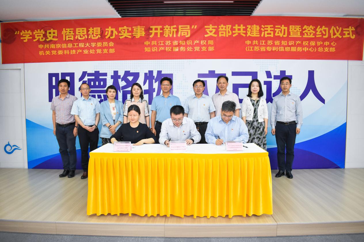 为扎实推进“学党史、悟思想、办实事、开新局”工作,以党建促业务,以业务强党建,经数月筹备,6月3日,我校科技产业处党支部在学校机关党委的指导和支持下,与江苏省知识产权局知识产权服务处党支部、江苏省知识产权保护中心(江苏省专利信息服务中心)总支部共同发起“不忘初心,继续前行——学党史 悟思想 办实事 开新局”支部结对共建活动暨协议签署仪式,开展党史学习教育和业务交流。三方全体党员出席了本次共建活动,科技产业处全体非党员干部也参加了本次活动。