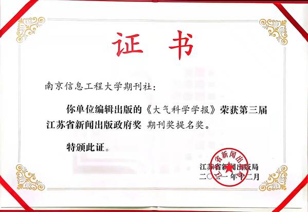 日前,江苏省新闻出版局主办的“第三届江苏省新闻出版政府奖”评选结果公布,我校《大气科学学报》荣获“期刊奖提名奖”,这是我校首次获此殊荣。