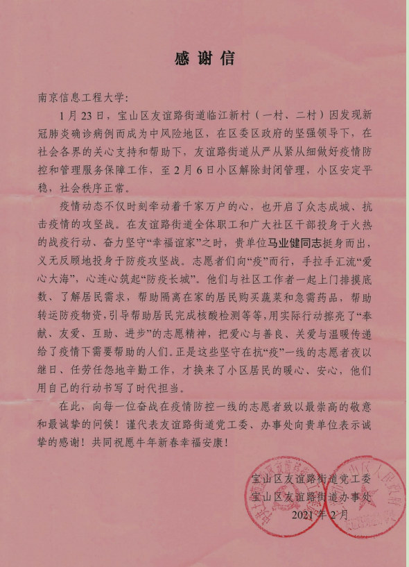 近日,我校收到上海市宝山区友谊路街道党工委、宝山区友谊路街道办事处寄来的感谢信,对我校大气科学学院2018级气象学专业学生马业健寒假期间投身战疫行动的事迹表示高度肯定和赞扬,并对学校表示感谢。