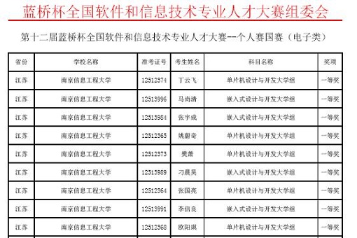 据了解,蓝桥杯大赛由工业和信息化部人才交流中心主办,2020年继续入选全国普通高校学科竞赛排行榜,是高校教育教学改革和创新人才培养的重要竞赛项目。在教务处和电子与信息工程学院的精心组织下,我校电子与信息工程学院、自动化学院、长望学院、物理与光电工程学院共90名学生参赛,共计获得江苏省一等奖42人,省二等奖17人,获奖率超过65%。全国决赛中,9人获得一等奖,20人获得二等奖。