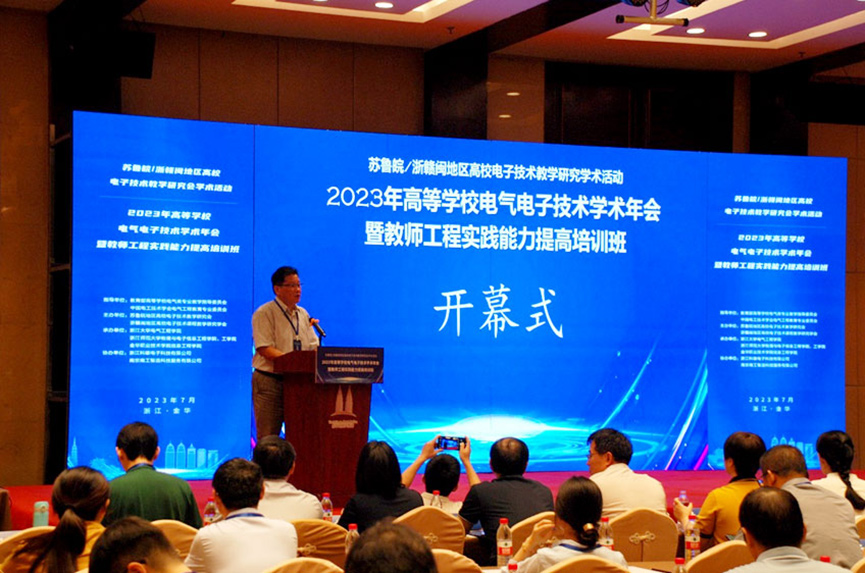 本次会议与培训由教育部高等学校电气类专业教学指导委员会与中国电工技术学会电气工程教育专业委员会指导,苏鲁皖地区高校电子技术教学研究会和浙赣闽地区高校电子技术课程教学研究学会主办,浙江大学电气工程学院、浙江师范大学物理与电子信息工程学院/工学院和金华职业技术学院信息工程学院共同承办,浙江科雄电子科技有限公司和南京南工智造科技服务有限公司协办。开幕式由中国电工技术学会电气工程教育专业委员会秘书长郁汉琪教授主持。