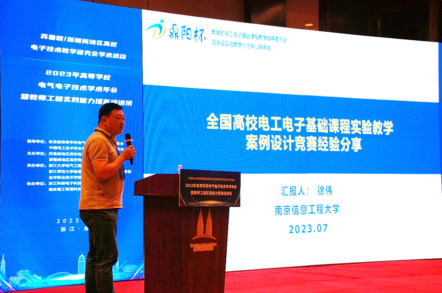 我校高度重视教师实践教学能力建设,近年来,工程训练中心系统性组织培训教师参加全国高校电工电子基础课程实验教学案例设计竞赛并在该赛事中成绩突出,学校连续三年获评华东赛区优秀组织奖。因此,中心两次国一获奖教师徐伟代表学校受邀请参加本次会议并作经验分享。