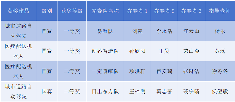 金牛湖园区安建大-南信大联培学生组建了四支队伍,分别征战城市道路自动驾驶和医疗配送机器人两个赛项,通过精心组队、悉心指导、团结协作和稳定发挥,最终斩获国赛一等奖2项、二等奖2项,充分展现了学生过硬的实践创新能力。