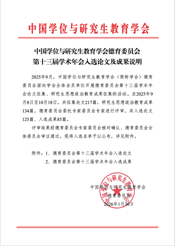 近日,中国学位与研究生教育学会德育委员会公布了第十三届学术年会入选论文及成果名单。我校在此次评选中表现突出,共有1篇论文和2篇案例入选,充分彰显了我校在研究生思想政治教育领域的创新实践与理论探索成效。