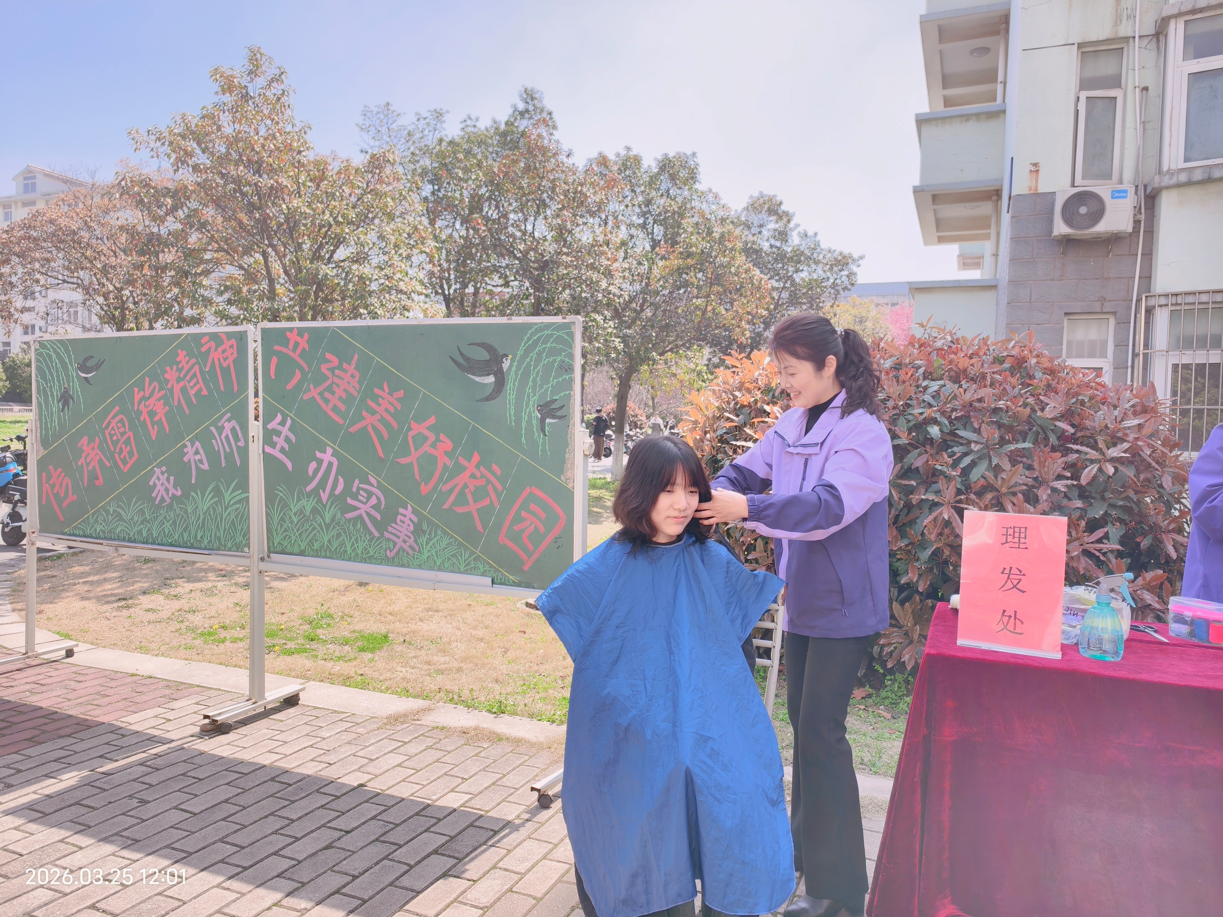 活动设置便民服务、健康关怀、文化传递以及示范引领四大板块,让志愿服务既有温度又有深度。比如,便民服务区聚焦师生日常需求,提供血压测量、衣物缝补、免费理发、眼镜清洗等贴心服务,精准解决生活中的小难题;健康关怀区同步普及保健知识,守护师生身心健康;文化传递区以“旧书换绿植”为载体,实现知识共享与环保理念传递的双向赋能;示范引领区则由党员先锋与宿管阿姨组成志愿者团队,以身作则践行雷锋精神,发挥先锋模范作用。
