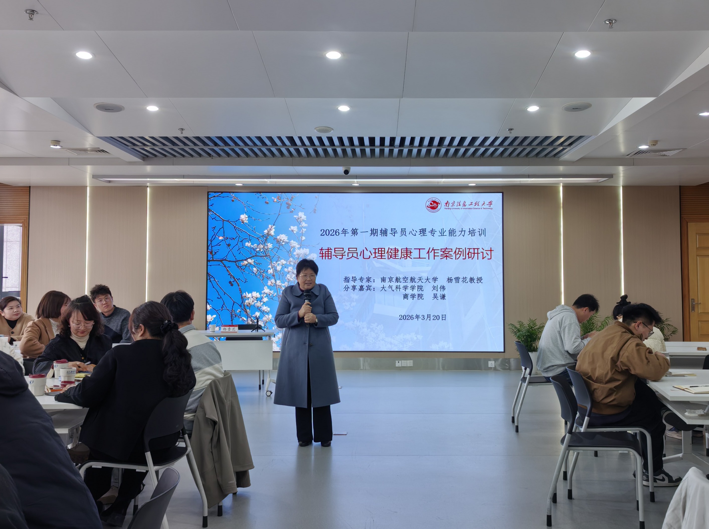 为持续提升我校辅导员队伍的心理育人工作能力,3月20日上午,学工处在图书馆报告厅举办了2026年第一期辅导员心理专业能力培训。本次培训主题为辅导员心理健康工作案例研讨,邀请了大气科学学院刘伟老师和商学院吴谦老师做了工作案例分享,并邀请了南京航空航天大学心理健康教育中心主任杨雪花教授对工作案例进行指导和点评。 60余名辅导员与心理中心老师参与了此次培训。