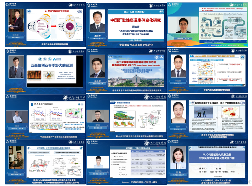 论坛上,国家气候中心宋连春研究员、胡婷研究员,南京师范大学戴强教授,以及我校周波涛教授、罗京佳教授、尹志聪教授、杨元建教授、孙博教授、杨洋教授、陈林教授、金建炳教授、王璐教授共12位专家,依次围绕“中国气候风险管理思考与实践”“近百年中国东部极端温度事件变化的检测归因与约束预估”“融合多元不确定性的中国降雨型滑坡暴露性时空预测”“中国群发性高温事件变化研究”“人工智能深度学习在天气气候预报中的应用”“西西伯利亚春季野火的预测”“基于深度学习和面向复杂建筑形态的城市冠层模型研究”“极端气候事件的变异及热带与中高纬的协同影响研究进展”“气溶胶减排的气候影响及其缓解措施探究”“前冬ENSO对华南前汛期降水影响的年代际增强:对流敏感性、ENSO衰减速度及WES反馈变化的作用”“Zeeman:区域高分辨率大气化学大模型”“MJO传播的动力机制及其对亚-澳夏季风爆发未来变化的关键作用”等主题,分享了所带团队的最新研究成果。报告内容聚焦气候系统预测预警技术创新、气候变化风险评估与应对策略等关键方向,充分展示了气候系统预测与变化应对全国重点实验室在相关领域的前沿动态和最新进展。