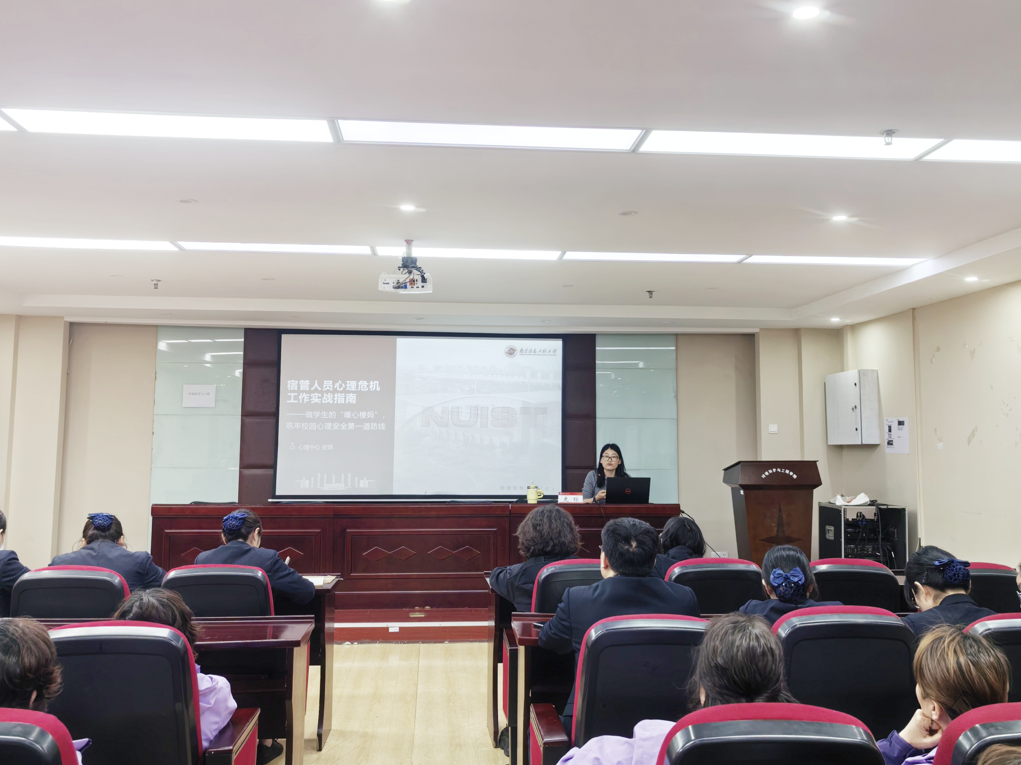 为进一步提升学生宿舍管理人员的心理危机识别与应对能力,4月20日,我校学生工作处在学科1号楼N201会议室举办了“宿管人员心理危机工作实战指南”专题培训。培训由我校心理中心史琼副研究员主讲,全校各宿舍楼栋宿管员、楼长及公寓管理中心工作人员共计90余人参加了培训。