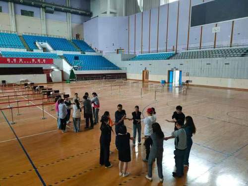 第一个暖身环节,参与活动的心理老师们随机分为两个小组,每个小组的老师以击掌形式互相认识,初步形成团队意识。随后小组全体成员拉手形成一个圆圈,再交叉构成一个圆圈,成员们需要利用自己的智慧恢复到最初的拉手姿势。这个环节中,两个小组均有一位老师主动指挥小组成员行动,李海乐随即将其任命为小组组长,以此和活动的积极响应者构建合作。