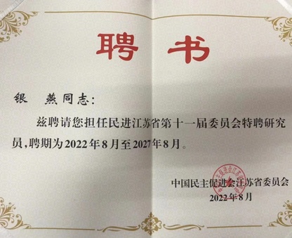 另悉,由我校民进支部参与完成的调研报告《关于争取国家实验室落地江苏的建议》被民进江苏省委采用,同时获评2021-2022年度参政议政成果一等奖。全国人大代表、校民进支部银燕教授受聘为民进江苏省第十一届委员会特聘研究员。