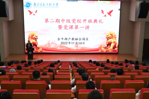 为了切实加强对入党积极分子的教育培训工作,根据《南京信息工程大学发展学生党员分级培训实施方案》相关要求,2022年11月14日晚,金牛湖产教融合园区第二期中级党校开班典礼暨党课培训第一讲通过线上线下相结合的方式在千秋会堂和腾讯会议同时举行。园区党委副书记、管委会副主任章胜,学生党务中心指导老师刘国东、陶然以及140余名入党积极分子参加了此次培训活动。