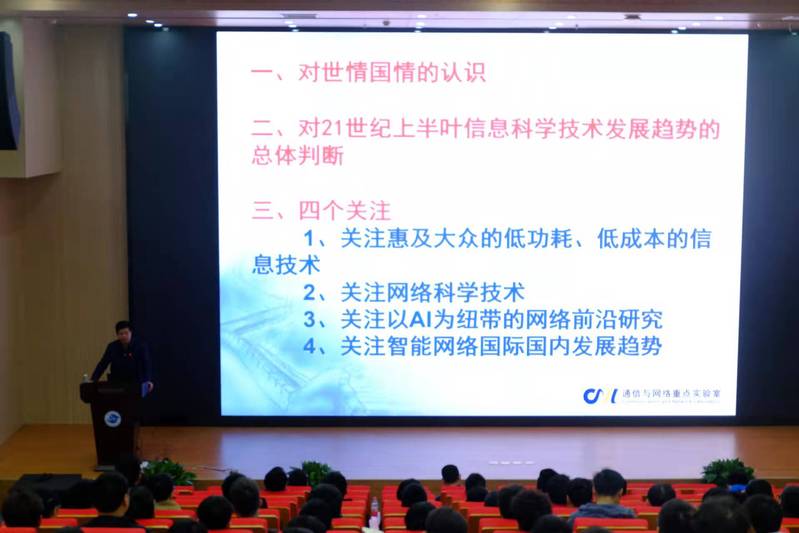 讲座伊始,潘成胜教授以深厚的爱国热情和世界的眼光,带领大家回顾21世纪上半叶信息科学技术的发展趋势并做出总体判断。他结合丰富的工作案例,特别是航天事业发展的重要节点,带领同学们正确认识世情国情,既看到中国科技创新领域的重大成果,又要看到现阶段与世界一流水平的不足。潘教授说,在计算机科技领域,一定要关注智能网络和信息技术发展创新。做好计算机科学技术研究,努力实现我国信息技术自主可控的IT产业体系的发展目标,就是要关注惠及大众的低功耗、低成本的信息技术,关注网络科学技术,关注以AI为纽带的网络前沿研究,关注智能网络国际国内发展趋势,让信息技术创新与爱国热情、报国志向同频共振,同向而行。