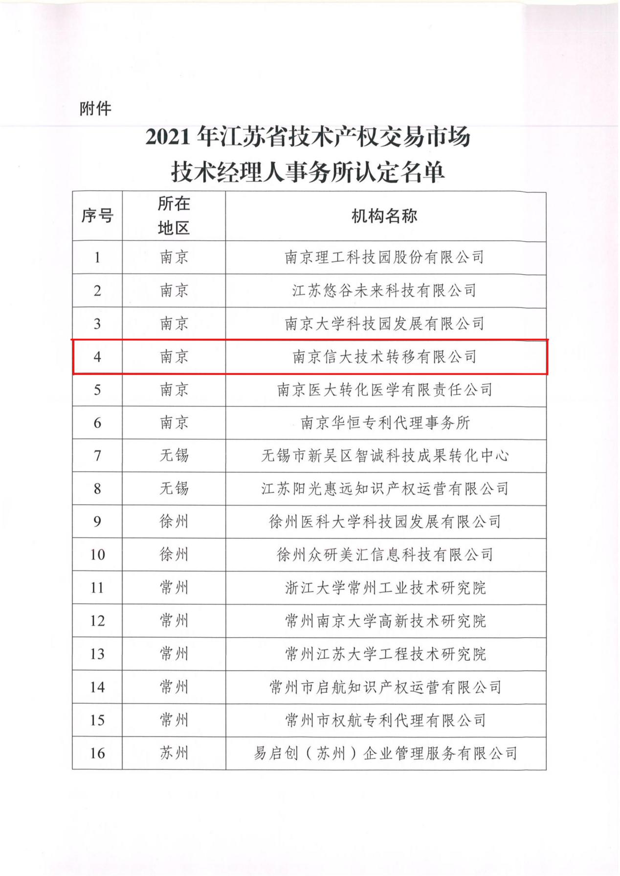 近日,江苏省科技资源统筹服务中心、江苏省技术产权交易市场发布了《关于公布2021年江苏省技术产权交易市场技术经理人事务所认定名单的通知》,我校技术转移实体化企业运作机构——南京信大技术转移有限公司经申报推荐、资格审查、专家评价等程序,成功入选为技术经理人事务所。