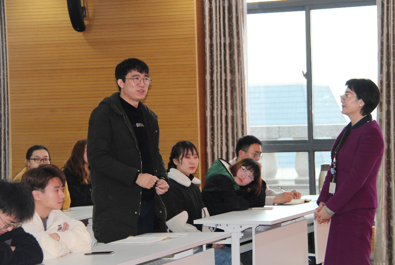 王苏春以“春华秋实”(No Autumn fruit without Spring Blossoms)为题作专题报告, 她首先从儒家的“仁义礼智信”谈起,阐释了对“德”的认识以及如何成为一个有德、有才的人。她认为,当代研究生首先应当做到:树“四观”讲“三讲”,树“四观”即树立正确的历史观、民族观、国家观、文化观, “三讲”,即做到讲格调、讲品位、讲责任。其次,应当处理好“三重关系”,即内外关系,要将国际眼光、中国视角、南信大视野结合起来看待问题;方圆关系,是要将规章制度的刚性与实际办事的柔性相结合,发扬“筷子精神”;大小关系,则要树立大格局,克服小立场,处理好学校、学院与个人的发展关系。她告诫同学们不能做精致的利己主义者,应做有理想有抱负的青年。第三,还应当掌握“5C定理”,即信心、能力、沟通、创新与合作,努力成为一个快乐和优秀的人。最后,王苏春勉励同学们发扬“三牛”精神,做好孺子牛、拓荒牛、老黄牛,只争朝夕,不负韶华。在互动交流环节,同学们积极提问,王苏春结合自身经历深入浅出地回答了研究生应如何讲责任、如何做好职场准备等问题,在场研究生们受益匪浅,感悟颇丰。