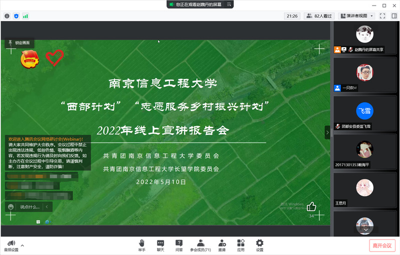 为更好的推进“西部计划”“江苏省志愿服务乡村振兴计划”志愿者招募工作,引导我校青年学子到祖国最需要的地方建功立业。5月10日,由校团委主办,长望学院承办的2022年“西部计划”“江苏省志愿服务乡村振兴计划”宣讲报告会线上成功举办。