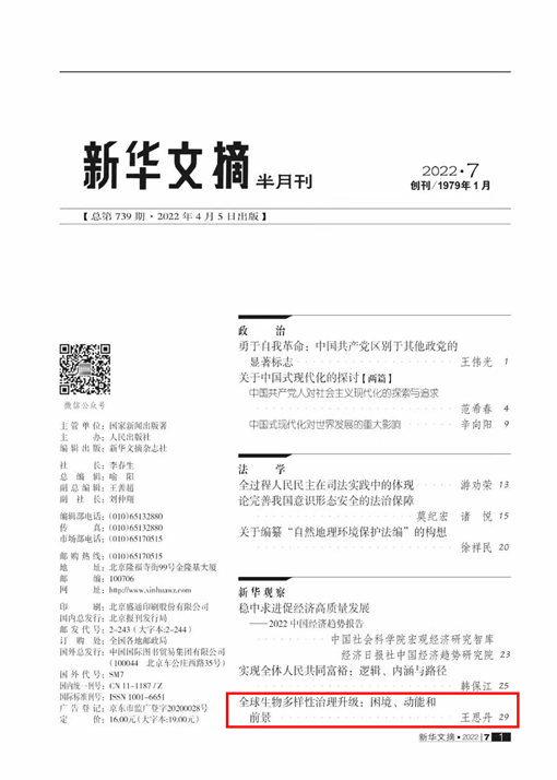 近日,《阅江学刊》2021年第5期《气象与人类社会》栏目刊发的《全球生物多样性治理升级:困境、动能和前景》一文获《新华文摘》(2022年第7期)全文转载,这是《阅江学刊》自创刊以来被《新华文摘》全文转载的第13篇论文。