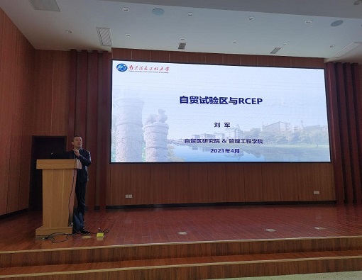 刘军以《自贸试验区与RCEP》为题进行了本次新生研讨课的讲授。他首先解析了自由贸易区的概念,介绍了全球主要自由贸易区的概况;然后,通过对当前世界经济形势的分析,阐释了我国国内国际双循环发展新格局的战略背景、核心要义和现实意义;接下来,刘书记介绍了我国自贸试验区建设的原因、概况和成效,并案例分析了上海自贸试验区和江苏自贸试验区的做法和成效;最后,从协定简介、协定成员、谈判经过、基本内容等方面介绍了区域全面经济伙伴关系协定(RCEP),并分析了该协定对当前世界经济格局和中国的影响。