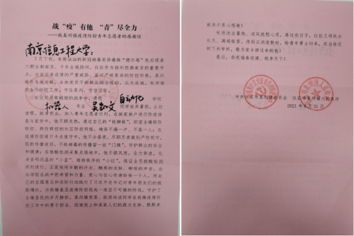 近日,仪征市真州镇向自动化学院发来感谢信,对学院2021级本科新生吴凯文暑期期间参与真州镇疫情防控工作表达了真挚的谢意。