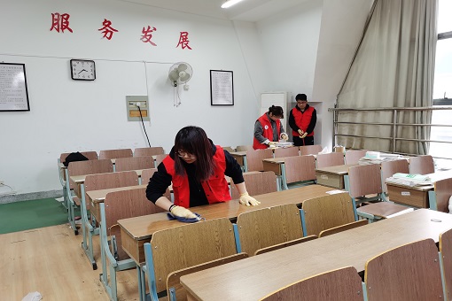 学院志愿者们手持扫帚、抹布等劳动工具有组织地对教室进行打扫,用双手塑造美好,用行动传递文明。打扫结束后,教室环境焕然一新,窗明几净,为师生提供了更好的工作与学习环境。