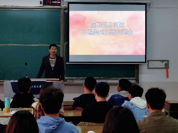 为促进各班级心理委员的交流与学习,应用技术学院于2021年4月21日中午在滨江楼S512教室召开心理委员经验交流会。学院党委副书记、副院长卢愿清、心理工作负责老师李俊言和2018级各班级心理委员出席了会议。