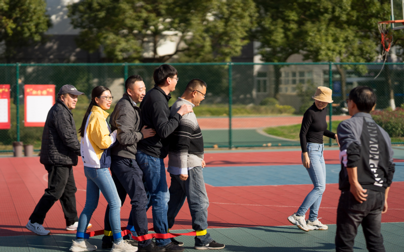此次团建活动共分为八个环节,每个环节都需要老师们团结协作共同完成。“巨人脚步”需要六位老师腿绑着腿合作前行,“珠行千里”需要两位老师协同发力把球运到终点,“一圈到底”需要六位老师手拉手肩并肩,把呼啦圈从起点转到终点,“神笔马良”需要六位老师共握一支大毛笔,合作完成“大气物理学院”六个字的书写……老师们在比拼的过程中既培养了默契,又增进了感情。