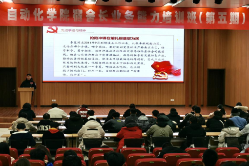 12月13日,自动化学院宿舍长业务能力培训班(第五期)在滨江报告厅如期开班。自动化学院学生党建中心副主任张佳严同学、宿舍文明建设中心宣传部长王志颖同学在会上先后发言。2021级全体宿舍长、生活委员和宿舍文明建设中心部分干部参加本次培训。