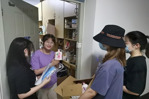 在女生宿舍分发防疫物资