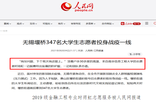 7月26日,江苏省委组织部印发《关于在疫情防控和防汛抗台中充分发挥基层党组织战斗堡垒作用和广大党员先锋模范作用的通知》,学校党委也第一时间发布《关于做好近期疫情防控工作的紧急通知》,管理工程学院师生闻令而动,积极投身一线志愿服务,让这个暑假有了别样的风采。这风采是“白色”的。5天60小时的打卡时长,这是2020级物流管理专业黄天同学交出的防疫答卷,在南京市江北新区全员核酸检测中,他主动请缨,穿上厚重的隔离服承担起核酸检测现场的人员引导、秩序维持等工作,受到了社区的好评。这风采也是“红色”的。测体温、查行程码、登记居民电子信息、制作居民防疫通行证……这是8月以来2021级金融工程专业新生顾宇辰的日常安排,与其他红色小马甲一样,他们都下沉到社区、医院、公园、学校等地,全身投入到核酸检测和疫苗接种等相关工作,成为防疫战线的一支重要力量。
