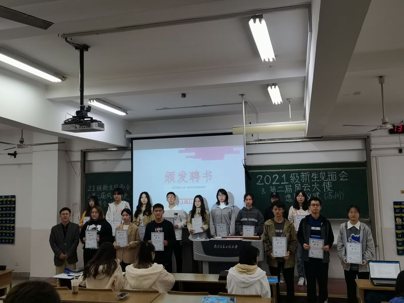 紧接着,活动进入颁发聘书环节。按照尊重意愿、综合推荐等原则,学院共遴选出28位“风云大使”,其中苏州籍16位,福建籍12位。28位同学分别上台领取聘书和纪念品。通过颁发聘书,同学们增进了身份意识,进一步意识到所肩负的“讲好南信大故事 传播南信大声音 传承新时代文明实践志愿精神”的责任和使命。正如发言代表吴悦所说:“担任风云大使是一种很好的实践,其意义不仅仅在于宣传南信大,更在于传递南信大的温度。”
