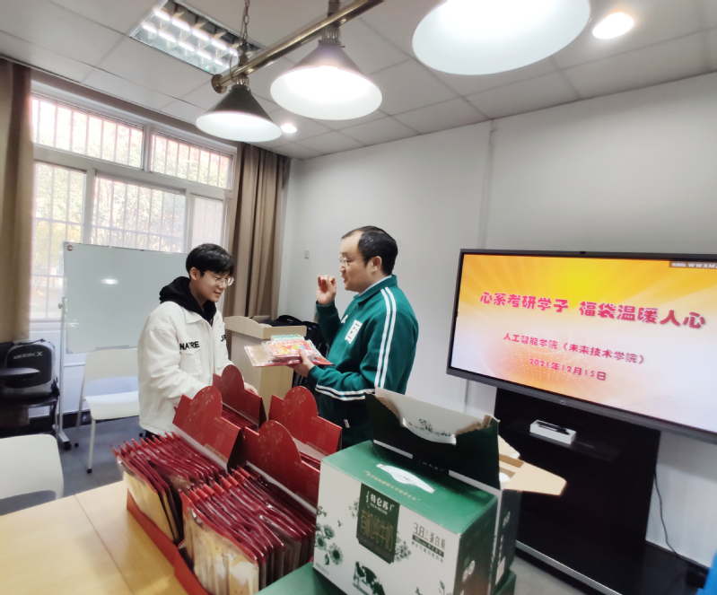 为增强学生备考信心、舒缓考前压力,12月17日下午,人工智能学院(未来技术学院)举办以“心系考研学子、福袋温暖人心”为主题的考研慰问活动。学院党委书记倪东鸿、副书记兼副院长秦书乐、学生工作办公室副主任曹芸、辅导员付龙海以及2022届考研学生代表参加活动。活动由秦书乐主持。