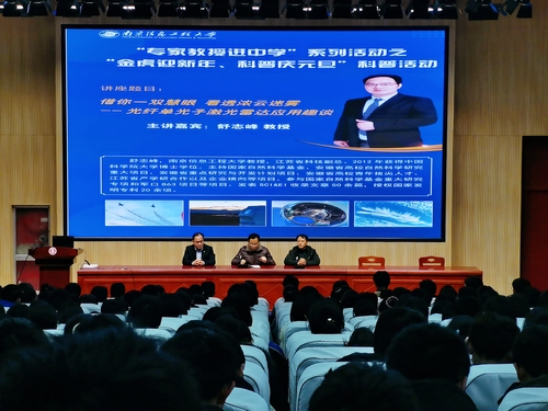 “教授进中学”活动中,舒志峰做了“借你一双慧眼,看透浓云迷雾——光纤单光子激光雷达应用趣谈”专题讲座,通过精心制作的PPT,从激光雷达的发展历程到军民融合的应用,从实际应用的案例再到目前在国内外获得的荣誉等方面为同学们做了科普性讲解。报告中,前沿的模型图片和大量科学研究数据及动态视频的展示,使同学们对激光雷达有了更深刻的认识和了解。精彩的讲座深深的吸引了师生认真听讲,激发了学生们对光纤单光子激光雷达研究的浓厚兴趣。随后,陈建坤从南信大的办学历史、学科优势、人才培养理念、校园文化特色、招生政策、“双一流”建设及取得的成绩等多方面详细介绍了南信大,并结合各生源基地中学“南京信息工程大学2021年‘高考录取喜报’”对各生源基地中学多年来给予南信大人才培养的大力支持表示了感谢,进一步扩大了我校的影响,取得了良好的效果。