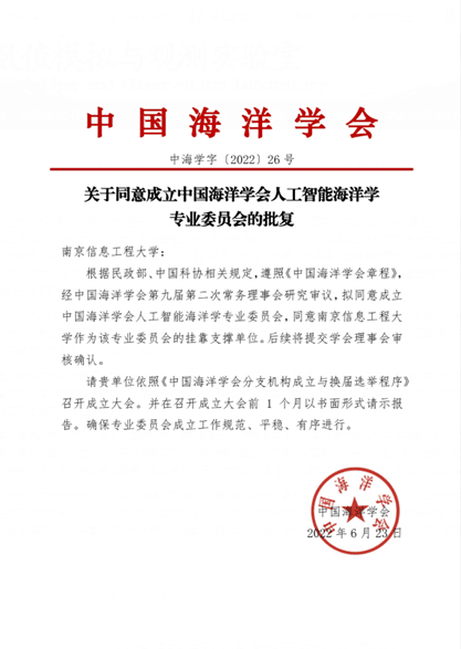 近期,经中国海洋学会第九届第二次常务理事会研究审议后发函《关于同意成立中国海洋学会人工智能海洋学专业委员会的批复》,拟同意以南京信息工程大学(以下简称我校)为挂靠支撑单位,联合我国人工智能、海洋科学、大气科学、计算机科学等学科专家学者、兄弟单位共同成立全国首个人工智能海洋学国家级专业委员会。