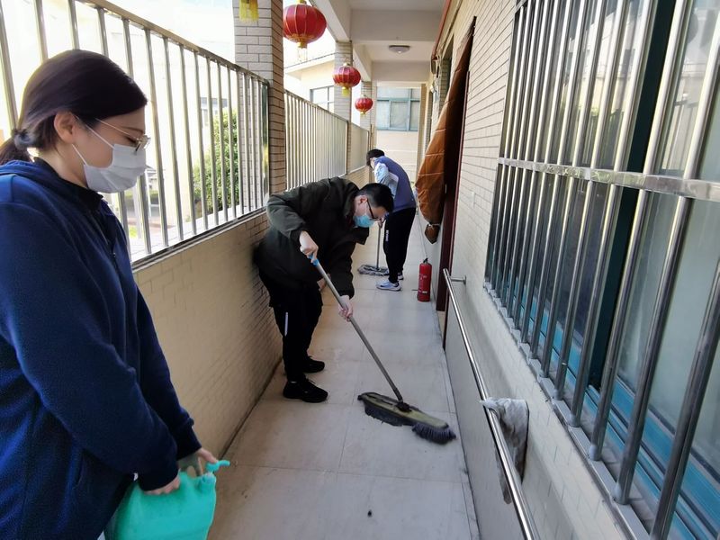 上午7点45分,志愿者们在学校旁边的公交站台集合出发。上车后,经过40多分钟的车程,志愿者们来到了养老院门口。一到那儿,养老院负责接待的工作人员便很热情地带领志愿者们进入了养老院。在走廊里行走的时候,志愿者们注意到了楼道地面上里面有些许灰尘。志愿者们便很快主动拿起了扫帚和拖把,热火朝天地打扫了起来,帮助爷爷奶奶们清理了楼道里的灰尘。
