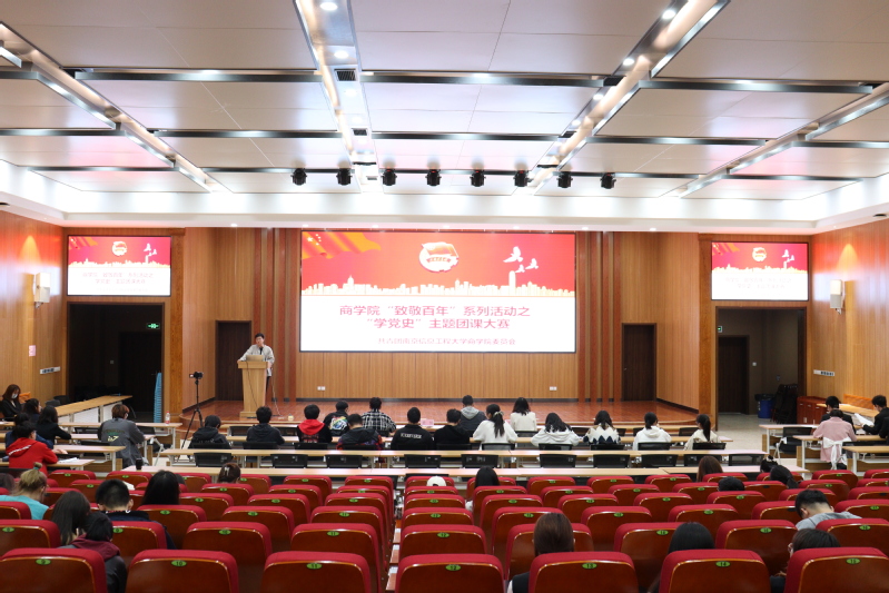 为响应学校开展大学生“学百年党史,承信大精神,担青春使命”主题教育活动的号召,以建党一百周年为契机,加强基层团支部思想引领建设,商学院团委于4月12日晚在滨江楼报告厅举办“致敬百年”系列活动之“学党史”主题团课大赛,担任本次活动的评审有商学院分团委书记史恒,辅导员刘国东,学生会主席韩钰、张竞泽,学院团委副书记樊小璇,商学院各班主要学生干部参会。