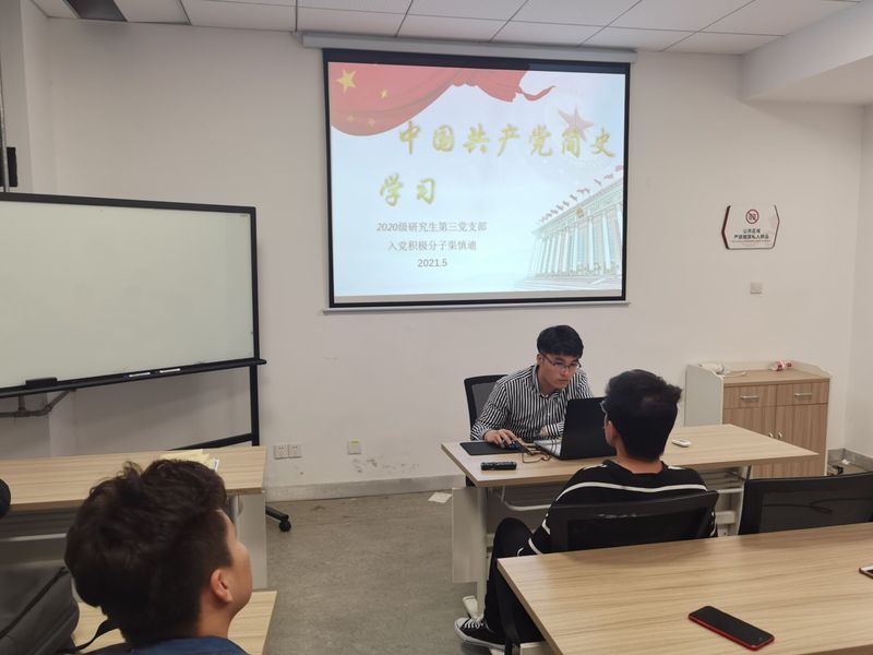 为深入学习中国共产党百年光辉历史,传承百年奋斗历程中产生的宝贵精神财富,5月7日晚,计软院2020级研究生第一、三党支部在计算机楼118联合开展以“学党史,悟思想,守初心”为主题的党史学习交流分享会。分享会由第三党支部书记耿良超主持,支部入党积极分子参加。
