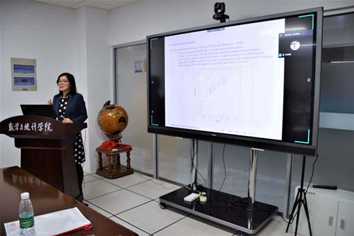 线下报告部分,复旦大学管理学院副院长、教育部统计学教指委委员郑明教授介绍了在因变量双重截断的情况下的回归系数的Mann–Whitney型估计量及大样本性质,并将该方法应用于类星体数据规律研究。