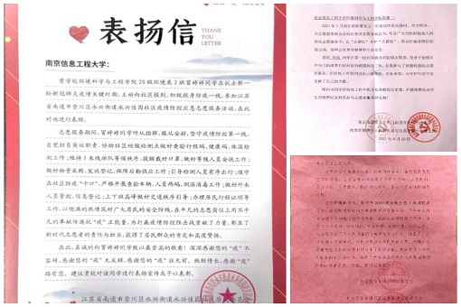 近日,环境科学与工程学院收到三封来自南京、南通、河南三地社区居委会的表扬信,信中感谢环科院三位同学在抗疫关键时刻挺身而出,积极投身防疫一线,在社区的抗疫志愿服务中彰显了新时代志愿者的责任和担当,他们的无私付出获得居民群众的肯定和高度赞扬。