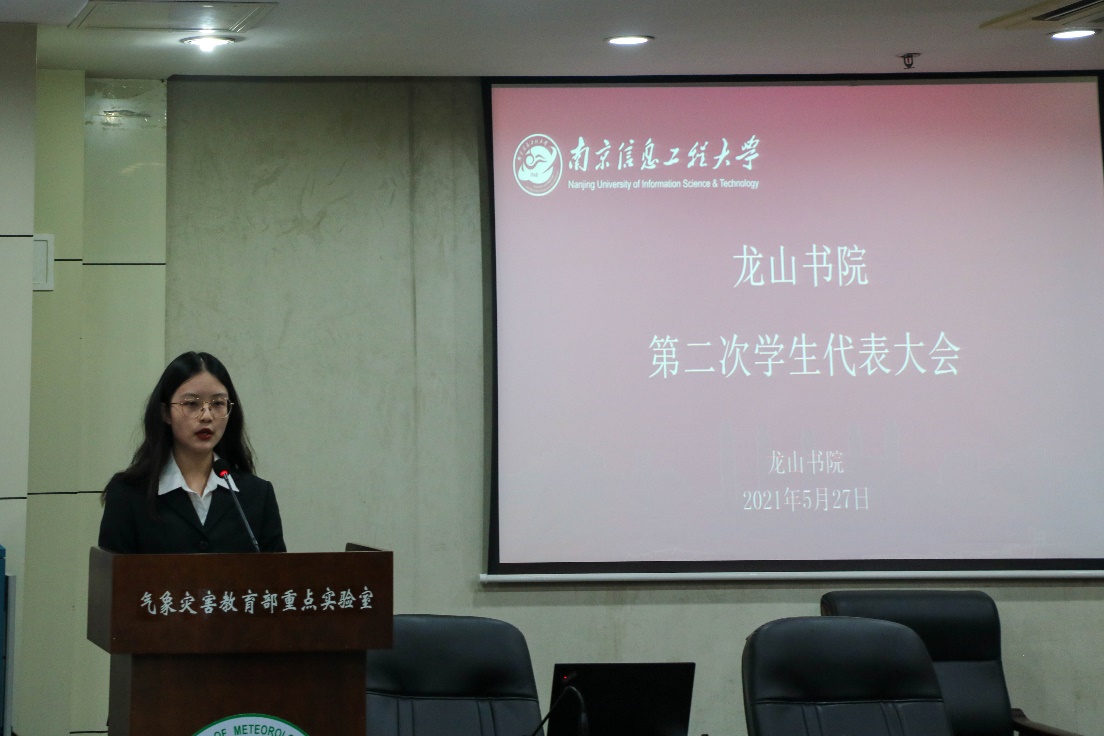 为进一步加强书院党总支对学生会的统一领导,全面提升学生会的政治性、先进性、群众性,同时完成学生会主席团换届选举工作,龙山书院于2021年5月27日在气象楼423召开第二次学生代表大会。出席本次大会的有龙山书院党总支副书记兼副院长刘红梅、学生工作办公室副主任高慧颖、分团委书记王永鹏,以及来自全院的46名学生代表。大会由学生会外联部部长李紫怡主持。