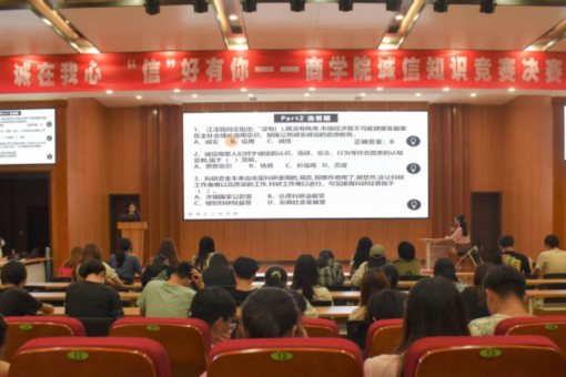 为构建和谐校园,宣传大学生资助政策,培养大学生的诚信意识和观念,进一步教育引导学生树立正确的人生观、价值观和荣辱观,商学院于5月31日晚在滨江楼报告厅开展“诚在我心,‘信’好有你——商学院诚信知识竞赛决赛”。14名选手成功通过初赛进入了决赛环节,近百名学生观摩了比赛。