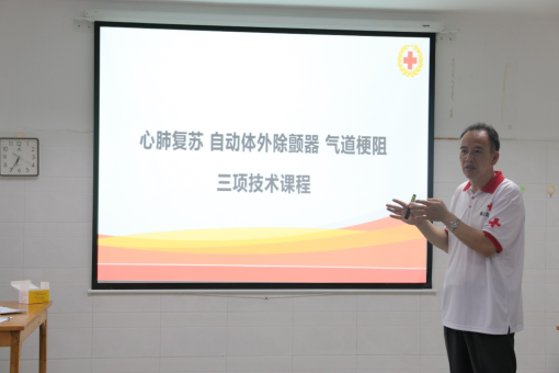 培训现场,王士荣医生利用PPT为学员们讲解了心肺复苏、自动体外除颤器、气道梗阻三个方面的急救技术。首先,大家在老师的指导下依次对现场提供的假人进行心肺复苏的练习。看着简单,实际做起来并不轻松。心脏按压时,或是因为身姿不对而使不上力,没法达到5厘米的按压深度;或是因为按压速度过快或偏慢,没有达到100-120次/分的正确频率;或是人工呼吸时嘴巴没包住假人的嘴而漏气。学员勤于学,老师乐于教,现场的学习气氛十分活跃。随后,王医生介绍了AED即除颤仪的用法。医生强调,“使用除颤仪的过程中大家严格按照要求操作,不能随便接触患者”。语音提示“建议电击”时,按下闪烁的除颤键,提示分析心率时任何人一定不要接触患者,提示电击时不能有任何人接触患者。王医生说,电击片我们急救人员有权贴上去,没有权利去下来,除120或者更高级的急救人员接手。最后,王医生简单介绍了遇到气道梗阻时我们该如何自救与救助他人,并演示了海姆立克急救法。教学完毕后,同学们两人一组,依次进行考试。
